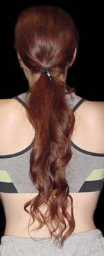 The Bunjiichick herself, "Tresses" The first cord I purchased for Bunjii was heavier than what is currently being used. I felt the ‘braking” action of the increased friction in the cordhub would help in putting it on – in other words you could pull the loop tight and it would stay that way on its own while you wrapped the remaining cord as desired. Over time I’ve learned that was a mistake. Wearers would assume that since the loop was tight they could wrap the remaining cord loosely. But of course the looseness would work back into the first loop and the whole thing would become loose. So now with a thinner cord the wearer must make each wrap tight. The taut parallel wraps combine into one continuous unit and hold... and hold! Another effect of the early thick cord was – it tended to (uh-oh) grab hair if the wearer wasn’t careful. I definitely heard plenty about that! But I haven’t heard any complaints of the problem lately – so it would seem the looser cord has done the trick. Of course when you have one surface moving against another a certain amount of care is called for in the area of your hair. It’s easy to learn to whip your Bunjii on with a minimum of attention, but some common sense is always a good thing. I’d say longhairs definitely give me the bulk of my orders. And there is a huge amount of repeat business, which has been most gratifying.