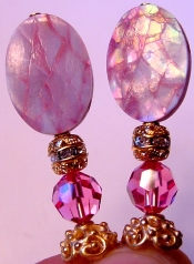 Pink Crystals These sticks are made up of shining, iridescent shell beads. Filigree gold beads with inlaid crystal band sits above beautiful rose Swarovski rounds. Accented with beautiful, gold accents. Price per pair: $23.00 on straight sticks, see pricing guide when topper is put on Ketylo sticks.