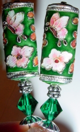 Emerald Blossoms Beautifully detailed Cloisonné rectangular tubes are done on a background of emerald green. Beneath the tube beads are genuine Swarovski crystal bicones in emerald. Silver accents and silver plated bead caps complete the set. Price per pair: $23.00 on straight sticks, see pricing guide when topper is put on Ketylo sticks.