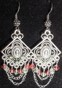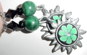 Starburst Mallie Genuine Malachite beads create a swirl of color above faceted rondelle and bicone Czech glass beads in Jet. Accented with Starburst dangles of lead free pewter with green, black and white design. Silver findings complete the pair. Price: $25.00 on straight sticks, see pricing guide when topper is put on Ketylo sticks.