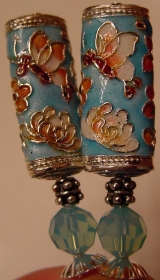 Powder Blue Blossoms Beautifully detailed Cloisonné rectangular tubes are done on a background of sky blue. Beneath the tube beads are genuine Swarovski crystal rounds in pacific opal.Not show here, but available as an option is a beautiful butterfly dangle that matches the design on the tube bead. At the center of the butterfly is a Swarovski crystal! Silver accents and silver plated bead caps complete the set. Price per pair: $23.00 on straight sticks, see pricing guide when topper is put on Ketylo sticks.