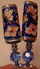 Sapphire Blossoms Beautifully detailed Cloisonné rectangular tubes are done on a background of deep blue. Beneath the tube beads are genuine Swarovski crystal rounds in sapphire. Silver accents and silver plated bead caps complete the set. Price per pair: $23.00 on straight sticks, see pricing guide when topper is put on Ketylo sticks.