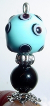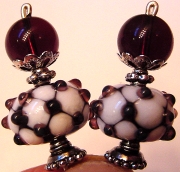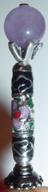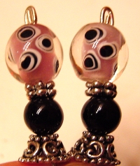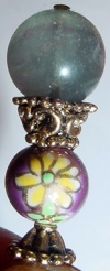 Eyes of Lavender Created of lampwork beads that sport swirls of black and white on a lavender center. Black onyx beads sit at the base. Accented with antiqued silver findings and floral shaped headpins. Price: $22.00 on straight sticks, see pricing guide when topper is put on Ketylo sticks.
