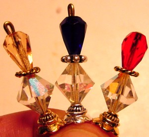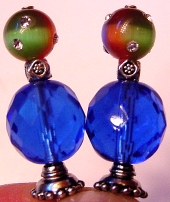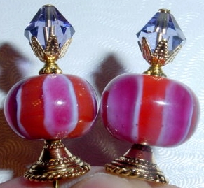 Vibrant This pair created of Swarovski bicone crystals in Tanzanite, and lampwork glass beads in multicolored stripes!! Accented with gold bead caps. Price: $23.00 on straight sticks, see pricing guide when topper is put on Ketylo sticks