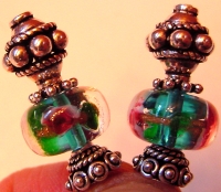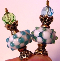 Switcharoo These sticks are made up of Peridot and Aqua Swarovski tops beads and gorgeous lampwork beads. The lampwork beads both have white backgrounds, but the accents colors on them are different, one Aqua, one Peridot. The Swarovski beads are reversed to make a mix match of the pair! Ornate gold accents complete the pair. Price per pair: $23.00 on straight sticks, see pricing guide when topper is put on Ketylo sticks.
