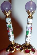 Adorned in White These sticks are a new line called "Adorned". We want to adorn you in a whole new look! Adorned toppers are made up of made up of beautifully detailed Cloisonné tubes and topped with a complimentary bead. In "White," the background of the tubes are white. Genuine Amethyst beads rest in gold plated caps. Cloisonné caps rest at base. Gold accents complete the pair. Bead at top can be substituted for most any other color on request. Price per pair: $22.00 on straight sticks, see pricing guide when topper is put on Ketylo sticks.