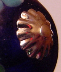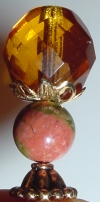 Amber United Czech glass in Amber sits in a beautiful die cut cap. The swirling colors of green and melon are lovely in this Unikite bead. Gold accents complete the topper. Price: $11.00 on straight sticks, see pricing guide when topper is put on Ketylo sticks.