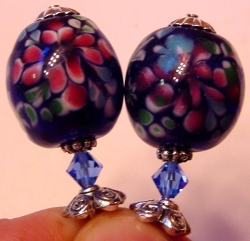 Florals on Blue These sticks are made up of lovely lampwork with a floral design on a pretty, blue background. Beautiful Sapphire Swarovski bicones and silver accents complete the set. This is another large size design. Price per pair: $24.00 on straight sticks, see pricing guide when topper is put on Ketylo sticks.