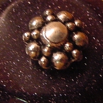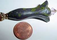 This Genuine stone is a solid shape tulip. The green does not show up at all like it does here flashed. It is a beautiful color, a muted dark amethyst. This came in a mixed lot of genuiune gemstones, but I can't figure out exactly what this is! It is the only one like this that I have. Accented here with antiqued gold beadcap, but could substitue silver accent instead. Single Price: $20.00 on straight sticks, see pricing guide when topper is put on Ketylo sticks.