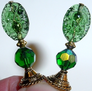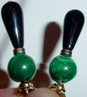 Saint Patrick's Night The beauty of Malachite sits beneath large, Czech glass tears in Jet. Accented with beautiful, gold findings. Price per pair: $23.00 on straight sticks, see pricing guide when topper is put on Ketylo sticks.