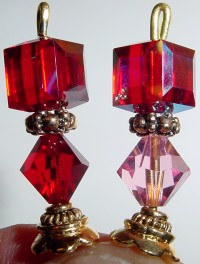 Sweethearts This beautiful pair is created with genuine Swarovski crystals in Siam or Rose bicones and Siam AB cubes! The reflective nature of the AB finish just gleams! Brilliant! Price: $23.00 (note: The bead cap {on the right} is simply off set in my hand, it will be even when assembled on the stick!) on straight sticks, see pricing guide when topper is put on Ketylo sticks.