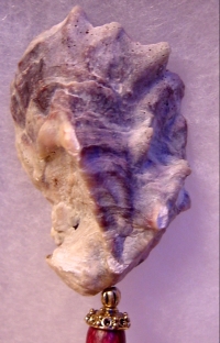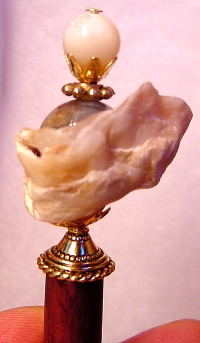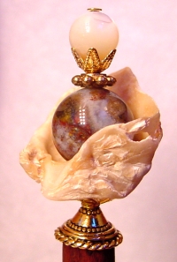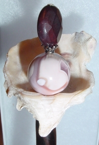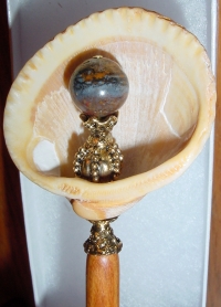 Paradise Island Large size arrangement!! This is a one of a kind single made up of a natural shell. Inside rests a Botswana Agate bead at base, and a Moukite faceted bead at top. Silver accents. Price: $18.00 on a straight stick, or $25.00 as shown here on a Mad. Ebony Ketylo stick (or any other Ketylo wood color choice).