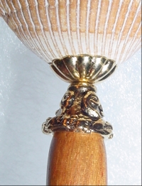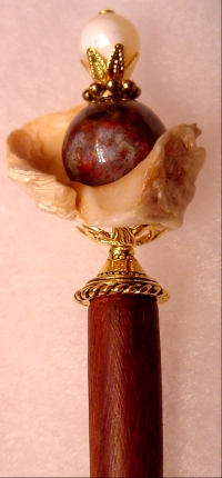 Golden Shore Large size arrangement!! This is a one of a kind single made up of a natural shell. Inside rests a die cast bead at base, and a Peitersite bead at top. Gold accents. Price: $18.00 on a straight stick, or $25.00 as shown here on a Ketylo stick in Gonalco Alves (or any other wood color choice).