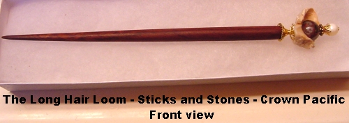 Crown Pacific This is a one of a kind single made up of a natural shell. Inside rests a Peitersite bead at base, and a mother of pearl bead at top. Gold accents. Price: $18.00 on a straight stick, $25.00 on a Ketylo stick.