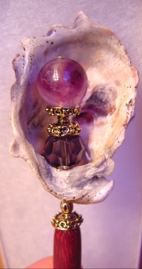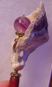 Floridian Cove Large size arrangement!! This is a one of a kind single made up of a natural shell. Inside rests a crystal Tanzanite bead at base, and a Fluorite bead at top. Gold accents. Price: $18.00 on a straight stick, as shown here on a Purpleheart Ketylo stick (or any other color) $25.00.