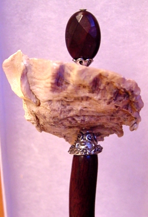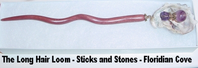 Amethyst Moon Genuine Fluorite, an intriguing gem sits atop this lovely stick topper! Fluorite ranges in color from darkest purple to nearly clear. This bead is palest purple with deep purple stripes running through at an angle. Celestial Crystal (Similar in quality to Swarovski) in dark amethyst, along with silver accents complete the topper. Price: $10.00 on straight sticks, see pricing guide when topper is put on Ketylo sticks. Go to Semi-Precious Gemstones and Swarovski Pairs & Singles Read the Testimonials and see completed sets from other buyers Hair stick toppers are not added to the sticks until you place your order. Here are some examples of the sticks the toppers are placed on. This should give you an idea of color and shape. Additional sticks in blonde wood are also available while supplies last, but only in 5 inch stick lengths only. These sticks are not shown.