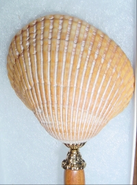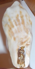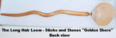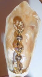 Goldenshore (natural shell) Natural shell like a lion's paw... inside is a stack of light Colorado topaz Swarovski and gold accents. Peek-a-boo cut away in back lets you glimpse the crystal from all sides. One single only: $15.00 on straight sticks, see pricing guide when topper is put on Ketylo sticks.