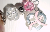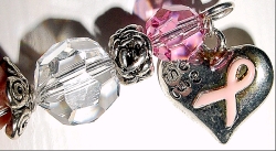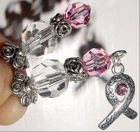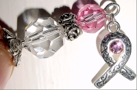 Never Give Up with Swarovski ribbon dangle This design is made up in honor of my Mom who is in her second battle against breast cancer (she has had three different types of breast cancer). It was sixteen years ago when cancer first entered Mom's life directly, and ours as well since you can't help but be effected by the suffering of those you love. The doctors said there was no hope, that it was only a matter of a short amount of time. But through God's will and doctor's care, Mom beat the "terminal cancer" diagnosis and was cancer free for 15 years. Two new cancers appeared last year and she has been battling ever since. I call this design the "Never Give Up" design, because you always need to keep hope alive. Profits from these sticks will go to help with medical expenses incurred. The basic design consists of Swarovski crystal top beads in light rose and German crystal beads at base. They are separated by a silver rose band and completed with silver accents. You pick your choice of dangle. You may order a single with or without the dangle, or you may order a pair, which consists of one with a dangle and one without. I find this is the best look. However, if you prefer two dangles, please let me know. Price per pair: $28.00 on straight sticks. Price per single, $14.00 see pricing guide when topper is put on Ketylo sticks. If you don't use hairsticks, but would be interested in earrings or necklaces with these BCA dangles, please email me about it!