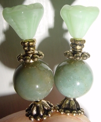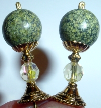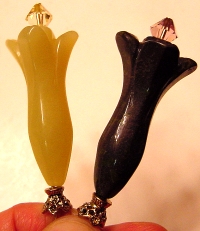 Milkglass Jasper Tulips This pair is made up of a milkglass green tulip top beads and genuine jasper beads at base. Antiqued gold accents complete the design. Price: $25.00 on straight sticks, see pricing guide when topper is put on Ketylo sticks.