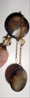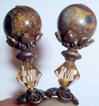 Marsisa This pair is created of nature's beauty. Black Shell flat, round shaped beads at top reflect golden, blue and gray hues, while jasper rounds at bottom accents beautifully. Copper findings complete the pair. The Black Shell beads match incredibly well with the Ketylo Dymondwood color "Charcoal" Price: $24.00 on straight sticks, see pricing guide when topper is put on Ketylo sticks.