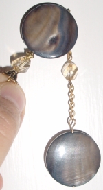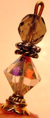 Charcoal Silvertone Medallion This single dangle design is made up of shell medallions. The color is more silvery than the pictures reflects, but it also has a golden tone as well. It matches the Ketylo Dymondwood color of Charcoal Silvertone very well. It is accented with a two light topaz channel cut Swarovski crystal beads. Like the top, but don't want the dangle? Just ask, price will be reduced. Price with dangle: $18.00 on a straight stick, see pricing guide when topper is put on Ketylo stick.
