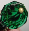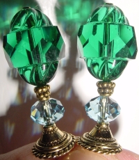Tree of Life Limited Edition! Beautiful Vintage German beads in Emerald sit atop this design. The intricate work on these beads is simple beautiful! It is combined with crystal beads in emerald color, but these beads also have a one sided AB finish (as shown on the right image). Gold accents complete the pair. Price per pair: $25.00 on straight sticks, see pricing guide when topper is put on Ketylo sticks.