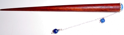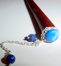 Longing for Lapis (Dangle) This design is made up of natural denim Lapis Lazuli. The cabochon is surrounded with sterling silver chain and also feature two Lapis Lazuli round beads. This is pre-made and measures at 4-3/4 inches long. This is a great size for half up style or for shorter hair. This can also be made on a longer stick upon request. Price: $11.00 on straight sticks, see pricing guide when topper is put on Ketylo sticks.
