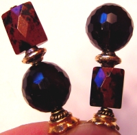 Crimson Crackle Crackled (rectangular) Quartz beads are the focal point of this pair. Beneath them sit Czech glass, faceted beads. Ornate gold complete the set. Matching earrings (single shot of one on right) are available for additional $10 with stick purchase or $15.00 when purchased individually. Price per pair: $23.00 on straight sticks, see pricing guide when topper is put on Ketylo sticks.