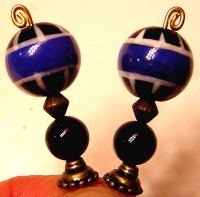 Transcontinental Created of hand painted glass beads in the color of blue, black and white, this pair is simply striking! Black onyx beads sit at the base. Accented with antiqued brass colored findings and floral shaped headpins. Price: $22.00 on straight sticks, see pricing guide when topper is put on Ketylo sticks.