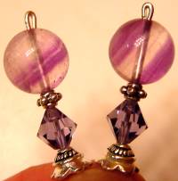 Streams of Amethyst Genuine Fluorite, an intriguing gem sits atop this lovely pair! Fluorite ranges in color from darkest purple to nearly clear. This pair is a light pale color with purple stripes running through. While it is not as vividly striped as this shows, you can still see the stripes. Florite when photographed, seems to really pick up all the hidden shades. Swarovski in Tanzanite (brighter than what it looks like in this picture), along with silver accents complete the pair. Price: $24.00 on straight sticks, see pricing guide when topper is put on Ketylo sticks.