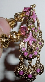 Aurora Single This dangle design is made up of Rose Swarovski and openwork golden bead at base. The pink enameled dangle is simply brilliant! Only one left of two made!! Hurry! This is your last chance for this design! Price: $13.00 on straight sticks, see pricing guide when topper is put on Ketylo stick.