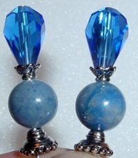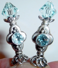 Crowned Blue (Topaz) This pair is made with Sterling Silver beads that are inlaid with genuine Topaz. Topaz gems are on two sides of the design. Top bicones are Swarovski Crystals in light Aqua. Price: $27.00 on straight sticks, see pricing guide when topper is put on Ketylo sticks.