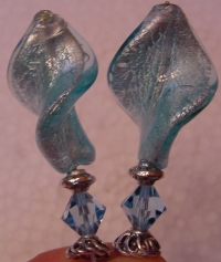 Arctic Ocean These sticks are made up of gorgeous silver foil, twisting Venetian beads in light blue. At the base rests bicone Swarovski crystals in aqua. Silver accents complete the pair. Price per pair: $31.00 on straight sticks, $41.00 when topper is put on Ketylo sticks.