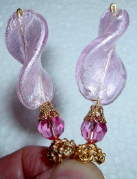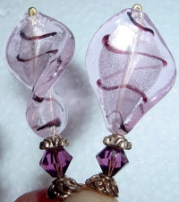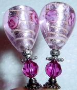 Violet Ribbons These sticks are made up of gorgeous silver foil, twisting Venetian beads in light pink with violet/amethyst stripes. At the base rests bicone Swarovski crystals in amethyst. Gold accents complete the pair. Price per pair: $31.00 on straight sticks, $41.00 when topper is put on Ketylo sticks.