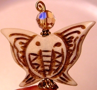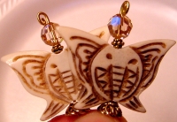 Dawning Butterflies These sticks are made up of caved bone butterfly beads topped with Light Colorado Topaz Swarovski crystals. Gold accents complete the pair. Price per pair: $24.00 on straight sticks, see pricing guide when topper is put on Ketylo sticks.