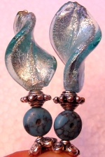 Around the World Genuine Turquoise beads sit above Aqua Czech glass rounds! Additional Czech glass mini-rondelle brings out the black markings in the turquoise. Silver accents complete the pair. Price: $23.00 on straight sticks, see pricing guide when topper is put on Ketylo sticks.