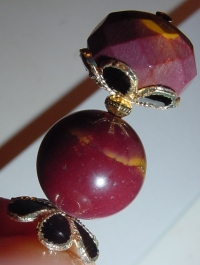 Dusk Beautifully Moukaite beads, in both faceted and smooth round, combine for a wonderful effect! The bottom bead has a slight "sunset" type coloring, which inspired the name. Both top and bottom beads has tiny bits of mustard swirling in it. Cloisonné bead caps in black and gold, and a gold plated bead finding complete the design . Price: $12.00 on straight sticks, see pricing guide when topper is put on Ketylo sticks.