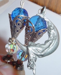 Angel in the Sky This pair is created of Swarovski round crystals in Crystal AB with Sapphire Czech glass beads above resting in Sterling plated cones, separated by a crystal band. A beautiful lady on the moon dangle accents one of the two sticks. Star accented findings in antiqued silver complete the design. Price: $24.00 on straight sticks, see pricing guide when topper is put on Ketylo sticks.