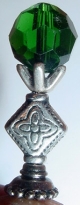 Celtic Dream Faceted, Celestial Crystal in Emerald green rests a top a beautifully designed sillver accent triangular bead. Silver accent completes the design. One single only: $11.00 on straight sticks, see pricing guide when topper is put on Ketylo sticks.