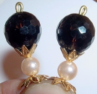 Evening Elegance Smoked Quartz beads with their small facets are simply stunning accented with Faux Champaign colored pearls. Gold findings complete the pair. Matching earrings available! Price: $24.00 on straight sticks, see pricing guide when topper is put on Ketylo sticks.