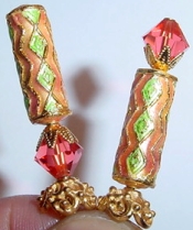 Melodious Cloisonné tube beads in shades of melon, green and gold are combined with Padparadscha Swarovski bicones. Accented with beautiful gold findings. Can be made as shown in reverse style or made to match identically. Price: $23.00 on straight sticks, see pricing guide when topper is put on Ketylo sticks.