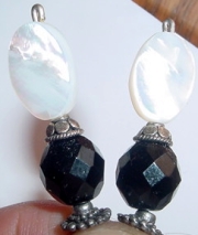 M.O.P. This pair created of Mother of Pearl flat ovals and Czech glass Jet Black rounds are a classic design. Accented with Sterling Silver findings. Custom black and white bone sticks are available to go with this pair. Email me for more information. Price: $23.00 on straight sticks, see pricing guide when topper is put on Ketylo sticks.