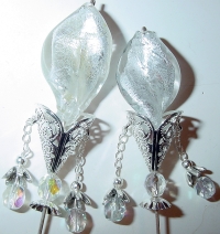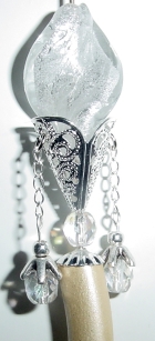 Silver Queen These sticks are made up of gorgeous, silver foil, Venetian beads in crystal. They sit in silver plated cones and have sterling silver chains that hang from the sides. Czech glass Crystal AB beads hang from dangles and sit beneath the twisting foil bead and cone. Sterling Silver plated beads and bead caps, and silver accents complete this amazing pair! I laid the pair down in the picture on left, so it doesn't look quite right. I slid one into a stick to show you how it hangs (shown on right). Price per pair: $35.00 on straight sticks, $42.00 when topper is put on Ketylo sticks.