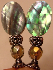 Mermayd These sticks are made up of shining iridescent mother of pearl-like oval flat beads. Accented with a beautiful rose ring band and other silver accents. They remind me of mermaids, so I chose to name them thus, only using the spelling that one of our Loom visitors uses. Price per pair: $21.00 on straight sticks, see pricing guide when topper is put on Ketylo sticks.