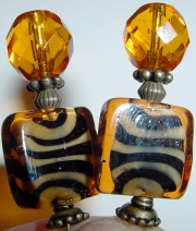 The Tiger Hear the roar! These sticks are made up of large Czech glass beads in amber and rectangular beads in a tiger's stripe! Accented with brass findings. Price per pair: $21.00 on straight sticks, see pricing guide when topper is put on Ketylo sticks.
