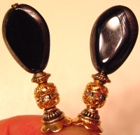Black Tears These sticks are made up of beautiful Czech glass black teardrop shaped flat beads. They are side cut, so that the edges have a slight frosted look. It's hard to capture in photographs, but if you look closely, you can see the contrast between the smooth, shiny black, and the frosted edge. Crystals are inlaid on the bottom filigree gold bead. Gold accents complete the pair. Matching earrings available for $10 with purchase of sticks or $15 alone. Price per pair: $20.00 on straight sticks, see pricing guide when topper is put on Ketylo sticks.