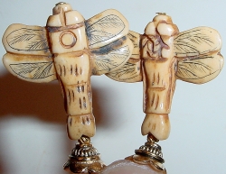 Flight of the Dragonfly These sticks are made up of beautifully carved bone. They are shown here photographed both front and back sides so you can see all of the carved design. Accented with a tiny vintage, gold bead at base, and gold accents. If you would like your dragonflies to have colored accents, I can create a string of small colored beads. Just ask if you are interested in colors. Price per pair: $23.00 on straight sticks, see pricing guide when topper is put on Ketylo sticks.