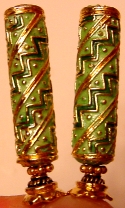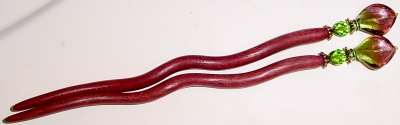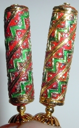 Radically Red Cloisonné tube beads in gorgeous shades of green, gold and red! Gold filled beads and gold plated accents at bottom. Really different, really unique! Price: $24.00 on straight sticks, see pricing guide when topper is put on Ketylo sticks.