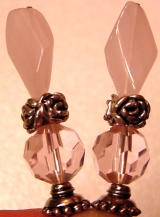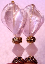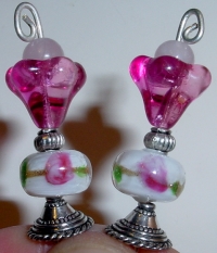 Lampwork Rose Tulips This pair is made up of transparent rose tulip top beads which hold small, rose quartz beads at center, and lampwork glass beads at base. Silver accents complete the design. Price: $24.00 on straight sticks, see pricing guide when topper is put on Ketylo sticks.
