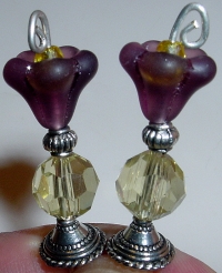 Lemon Lavender Tulips SOLD!!!This pair is made up of a dark purple matte tulip top beads which hold small yellow Czech glass beads. Crystal beads in lemon rest at base. Silver accents complete the design. Price: $24.00 on straight sticks, see pricing guide when topper is put on Ketylo sticks.